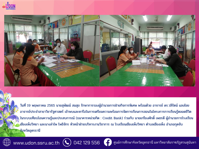 On 19th May 2022 Mr. Supat Somsuk, the Acting Vice Director of Special Affairs; and Dr. Waleerat Sangchai, a Lecturer of the Program of Political Science, visited and discussed the Life Long Learning Project of Knowledge and Experience Credit Transfer (Credit Bank) with Mr. Kriengsak Petchdee, the School Director; and Mrs. Lamphai Phothichak, the Head of Academic Administration, at Chiang Pheng Wittaya School, Chiang Pheng sub-district, Kut Chap district, Udon Thani.