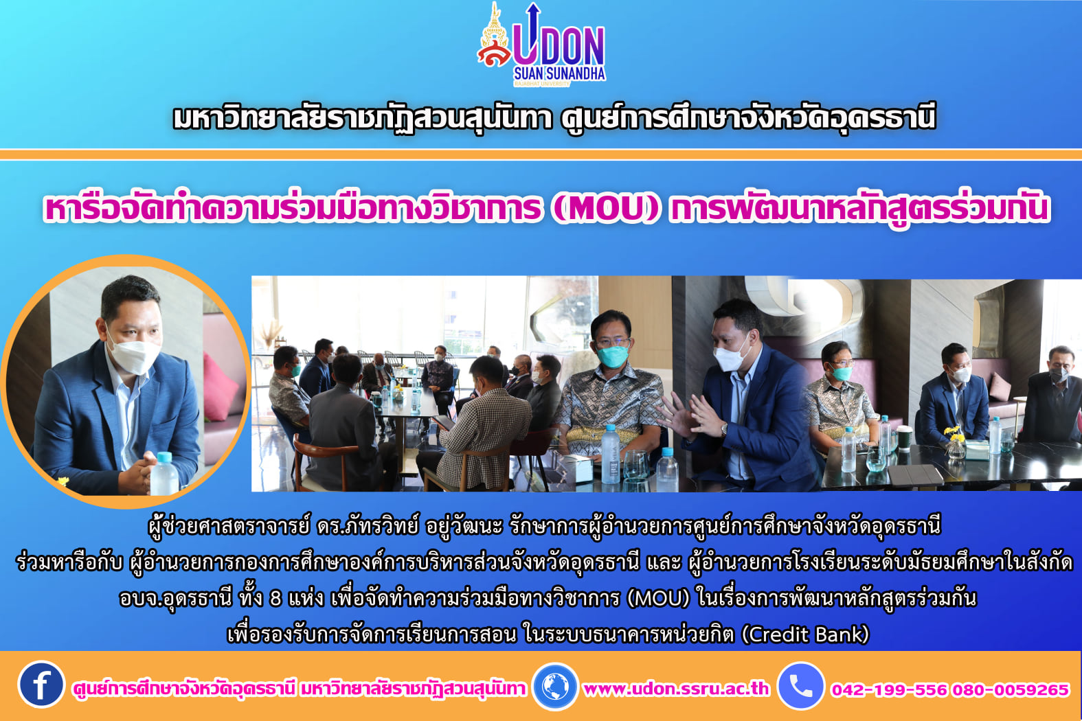 ในสังกัด อบจ.อุดรธานี ทั้ง 8 แห่ง เพื่อจัดทำความร่วมมือทางวิชาการ (MOU) ในเรื่องการพัฒนาหลักสูตรร่วมกันเพื่อรองรับการจัดการเรียนการสอนในระบบธนาคารหน่วยกิต (Credit Bank)
