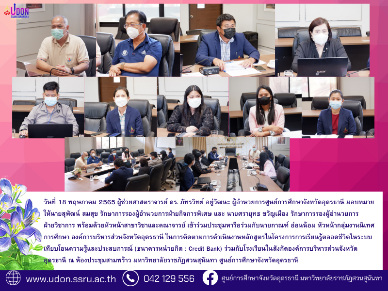 assigned Mr. Supat Somsuk, the Acting Director of Special Affairs; and Mr. Sarayut Kwanmuang, the Acting Director of Academics; including the Heads of each programs and the lecturers to attend the meeting to discuss with Mr. Kant Onnom, the Head of the Education Supervision Department, regarding Life Long Learning Learning Project of Knowledge and Experience Credit Transfer (Credit Bank) in Sam Phrao Meeting Room at Suan Sunandha Rajabhat University, Udon Thani Center.
