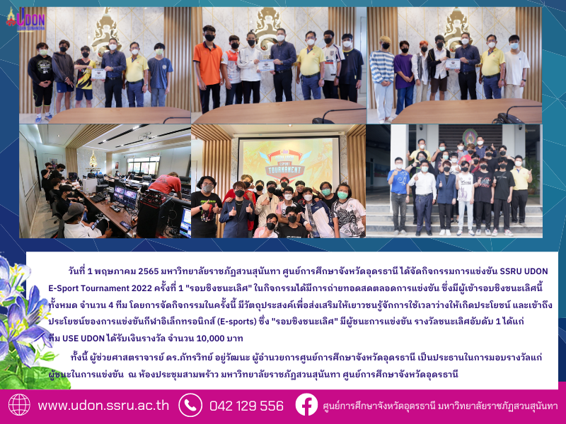 On 1st May 2022, Suan Sunandha Rajabhat University, Udon Thani Education Center organized the 1st SSRU UDON E-Sport Tournament 2022, Final Round. The tournament was online broadcasted throuout the competition consisting of 4 teams to encourage the youth sparing free time productivitively and exploiting E-sports. The winner was USE UDON team and rewarded the prize of 10,000 baht. In this regard, Asst. Prof. Dr. Pattaravis Yoowattana, the Director of Suan Sunandha Rajabhat University, Udon Thani Education Center presided the award ceremony at Sam Phrao Meeting Room, Suan Sunandha Rajabhat University, Udon Thani Education Center.