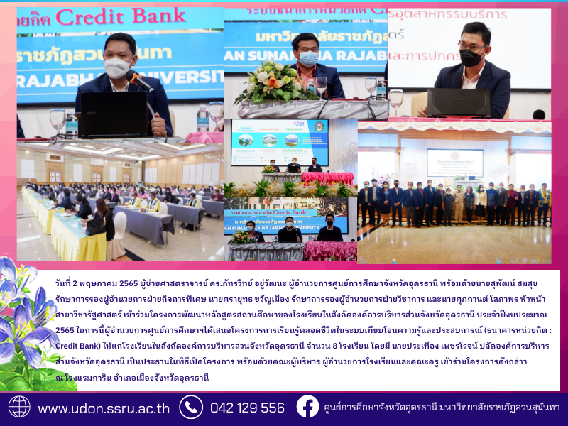 On 2nd May 2022 Asst. Prof. Dr. Pattaravis Yoowattana, the Director of Suan Sunandha Rajabhat University, Udon Thani Center; Mr. Supat Somsuk, the Acting Vice Director of Special Affairs; Mr. Sarayut Kwanmuang, the Acting Vice Director of Academics, and Mr. Suphakarn Sophaporn, the Head of Political Science Program, attended the Curriculum Development Project of Schools under the Control of Udon Thani's Provincial Administrative Organization in the Budget Year of 2022. In this regard, the Director recommended the Life Long Learning Project of Knowledge and Experience Credit Transfer (Credit Bank) to 8 schools. In this regard, Mr. Prathueng Petchroj, the Permanent Secretary of Udon Thani's Provincial Administrative Organization, presided over the opening ceremony, also the chief officers, the school directors, and teachers attended at Karin Hotel, Muang district, Udon Thani.
