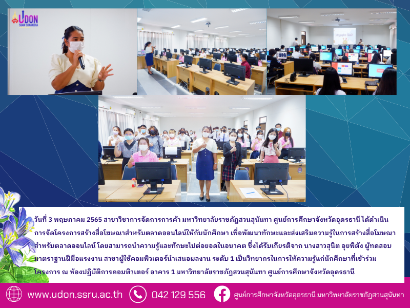 On 3rd May 2022 The Trade Management Program of Suan Sunandha Rajabhat University, Udon Thani Education Center, organized the Project of Advertisement Creation for Online Market to develop and support the students' skills to be furthered in the future. In this regard, the center was honoured from Mrs. Sunit Uyapitang, the National Inspector of Computer Presentation Level 1, to lecture the students in the Computer Operation Room at the Building 1, at Suan Sunandha Rajabhat University, Udon Thani Education Center.