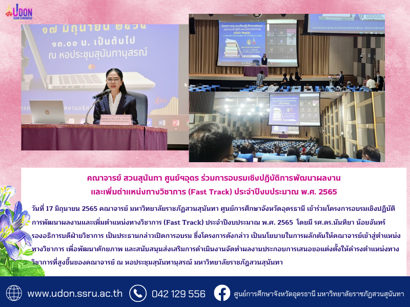 On 17th June 2022 The lecturers of Suan Sunandha Rajabhat University, Udon Thani Education Center, participated in the Workshop of Work Outcome Development and Academic Position Advancement (Fast Track) in the budget year of 2022. In this regard, Assc. Prof. Dr. Nantiya Noychan, the Vice Director of Academics, presided over the Workshop.