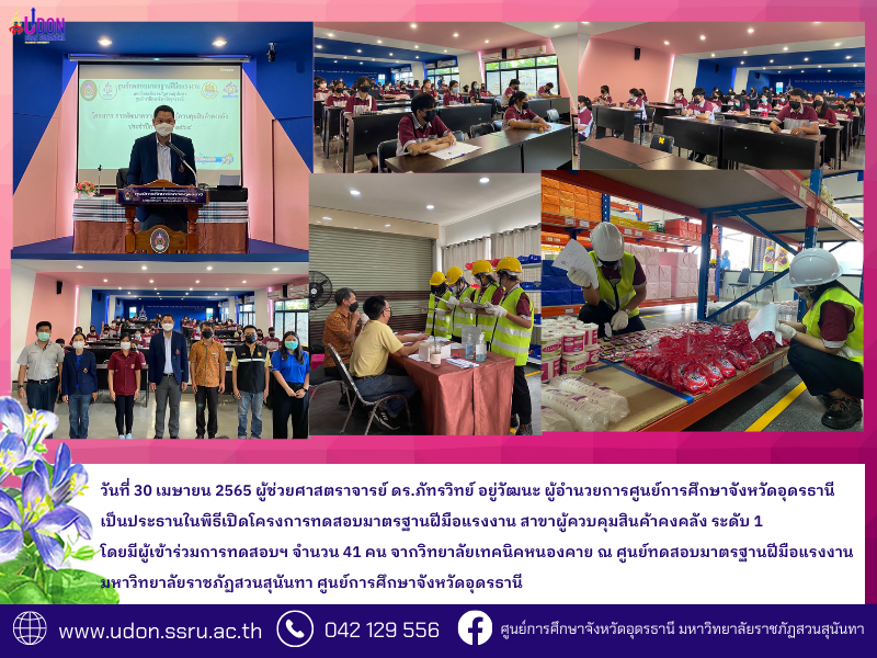 On 30th April 2022 Asst. Prof. Dr. Pattaravis Yoowattana, the Director of Suan Sunandha Rajabhat University, Udon Thani Education Center, presided over the Opening Ceremony of the Skill Standard Testing Workshop Project for National Inspector of Inventory Operator Level 1. The 41 participants from Nong Khai's Vocational College were attended in Skill Standard Testing Center at Suan Sunandha Rajabhat University, Udon Thani Education Center.