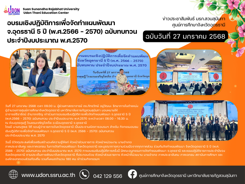 On January 27, 2025, at 9:00 a.m., Assistant Professor Dr. Phattarawee Yoowattana, Acting Director of the Udon Thani Education Center, Suan Sunandha Rajabhat University, assigned Ms. Teerarat Amnatcharoen to participate in the Workshop for Developing the Udon Thani Provincial Development Plan (2023–2027) Review for the 2027 Fiscal Year. The workshop was held from 8:00 a.m. to 4:30 p.m. at the Udon Dusadee Room, Charoen Hotel, Mueang Udon Thani District, Udon Thani Province.