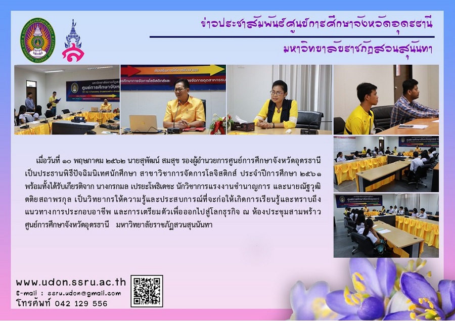 On 10 May 2019, Mr. Supat Somsuk, Deputy of Udon Thani Education Center was the chairman of the post training activity of Logistics Management, Academic Year 2018. This activity received an honor from Mrs. Kornkamol Perayapotidecha, (Ministry of Labour) and Mr. Nattawoot Tatiyastapornkul (Alumni) as the keynote speakers to give and exchange knowledge and experience about career pathways at Samprow Seminar Room, UDEC , SSRU