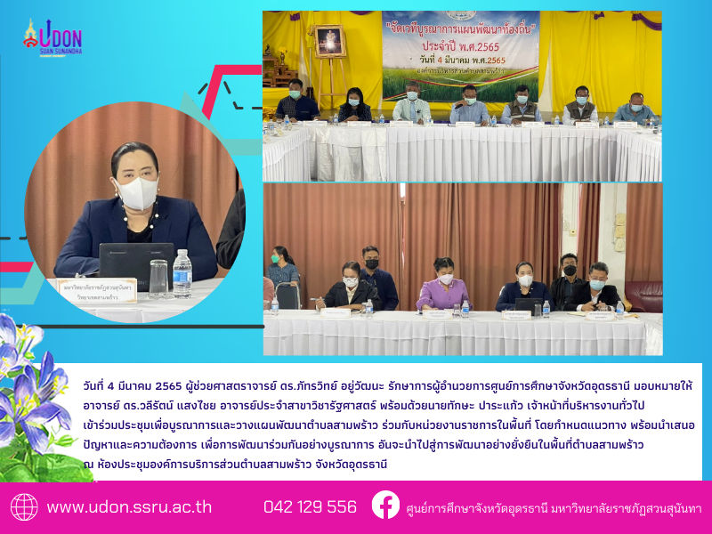 Asst. Prof. Dr. Pattaravis Yoowattana, the Acting Director of Suan Sunandha Rajabhat University Udon Thani Education Center, assigned Dr. Waleerat Sangchai, the Head of Political Science Program; and Mr. Taksa Parakaew, the General Administration Officer, to attend the meeting of Integration and Planning for Sam Phrao Sub-district with local public sectors. The guidelining and the statement of the problems and requirements were discussed holistically regarding sustainability of Sam Phrao's area at the meeting room of Sam Phrao's Sub-district Administration Organization, Udon Thani.