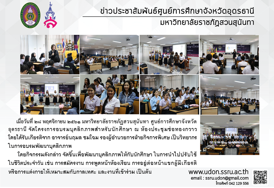 เมื่อวันที่ 28 พฤศจิกายน ๒๕๖๑ มหาวิทยาลัยราชภัฏสวนสุนันทา ศูนย์การศึกษาจังหวัดอุดรธานี จัดโครงการอบรมบุคลิกภาพสำหรับนักศึกษา ณ ห้องประชุมช่อทองกวาว โดยได้รับเกียรติจาก อาจารย์นฤมล ชมโฉม รองผู้อำนวยการฝ่ายกิจการพิเศษ เป็นวิทยาก ในการอบรมพัฒนาบุคลิกภาพ