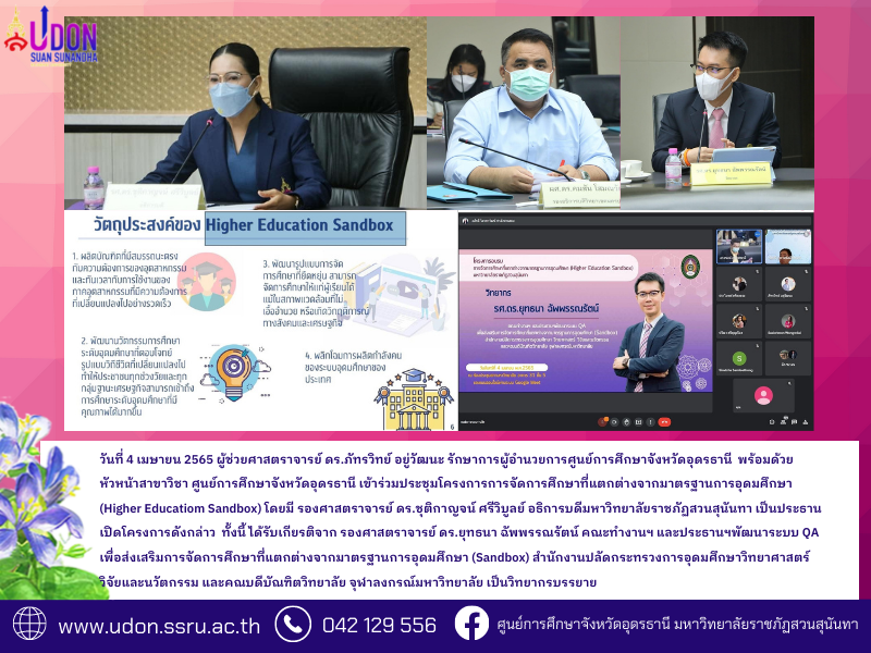 On 4th March 2022 Asst. Prof. Dr. Pattaravis Yoowattana, the Acting Director of Suan Sunandha Rajabhat University Udon Thani Center, as well as the heads of each programs attended the Higher Education Sandbox's Project Meeting. In this regard, Assoc. Prof. Chutikarn Sriviboon, the President of Suan Sunandha Rajabhat University, presided over the opening ceremony and the University was honored that Dr. Yootthana Chuppunnarat, the President and Council of Quality Assessment of Higher Education Sandbox, Office of the Permanent Secretary of Ministry of Higher Education, Science, Research and Innovation; and, the Dean of Graduate School of Chulalongkorn University, performed a lecture.