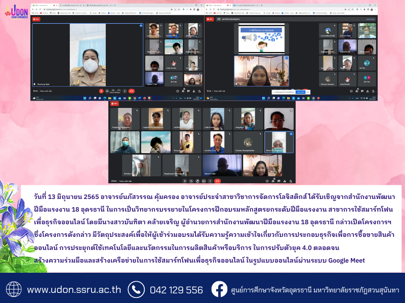 On 13th June 2022 Ms. Napassawan Kumklong, a lecturer of Logistics Management Program; was invited by the 18th Udon Thani Institute for Skill Development to lecture at the Labour Skill Heightening: Smart Phone for Online Business. In this regard, Ms. Banthita Klaicharoen, the Director of the 18th Udon Thani Institute for Skill Development, gave an opening speech. The project aimed to convey the knowledge of online market, applying technology, and innovation of production/service of adjustment in 4.0 era including cooperation and network creation of smart phone for online business via Google Meet.