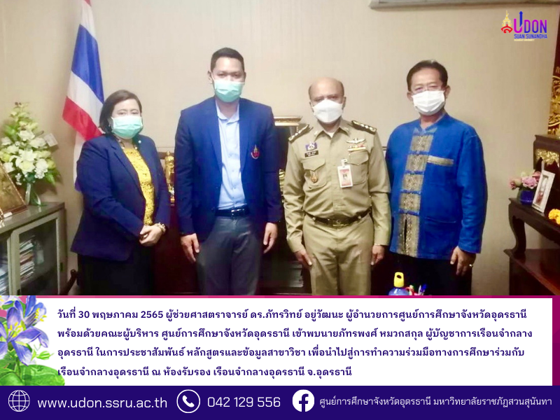 วันที่ 30 พฤษภาคม 2565 ผู้ช่วยศาสตราจารย์ ดร.ภัทรวิทย์ อยู่วัฒนะ ผู้อำนวยการศูนย์การศึกษาจังหวัดอุดรธานี พร้อมด้วยคณะผู้บริหาร ศูนย์การศึกษาจังหวัดอุดรธานี เข้าพบนายภัทรพงศ์ หมวกสกุล ผู้บัญชาการเรือนจำกลางอุดรธานี ในการประชาสัมพันธ์ หลักสูตรและข้อมูลสาขาวิชา เพื่อนำไปสู่การทำความร่วมมือทางการศึกษาร่วมกับเรือนจำกลางอุดรธานี ณ ห้องรับรอง เรือนจำกลางอุดรธานี จ.อุดรธานี