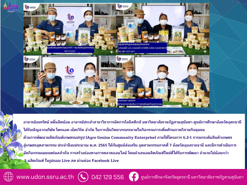 อาจารย์อมรรัตน์ หมื่นจิตน้อย อาจารย์ประจำสาขาวิชาการจัดการโลจิสติกส์ มหาวิทยาลัยราชภัฏสวนสุนันทา ศูนย์การศึกษาจังหวัดอุดรธานี ได้รับเชิญจากบริษัท โพรแอค เน็ตเวิร์ค จำกัด ในการเป็นวิทยากรบรรยายในกิจกรรมการเพิ่มศักยภาพวิสาหกิจชุมชน ด้านการพัฒนาผลิตภัณฑ์เกษตรแปรรูป (Agro Genius Community Enterprise) ภายใต้โครงการ 6.2-1 การยกระดับสินค้าเกษตรสู่เกษตรอุตสาหกรรม ประจำปีงบประมาณ พ.ศ. 2565 ให้กับศูนย์ส่งเสริม อุตสาหกรรมภาคที่ 7 จังหวัดอุบลราชธานี และมีการดำเนินการจัดกิจกรรมเผยแพร่ผลสำเร็จ การสร้างช่องทางการตลาดออนไลน์ โดยนำเสนอผลิตภัณฑ์ใหม่ที่ได้รับการพัฒนา จำนวนไม่น้อยกว่า 5 ผลิตภัณฑ์ ในรูปแบบ Live สด ผ่านช่อง Facebook Live