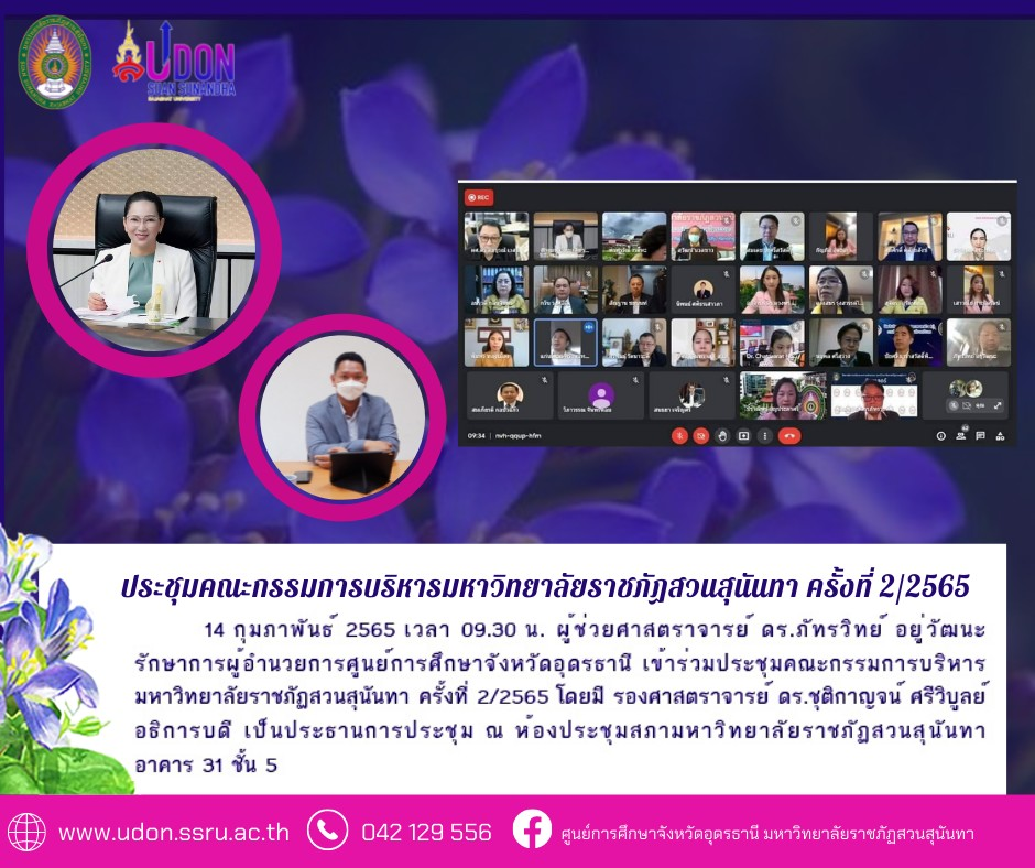 14 กุมภาพันธ์ 2565 เวลา 09.30 น. ผู้ช่วยศาสตราจารย์ ดร.ภัทรวิทย์ อยู่วัฒนะ รักษาการผู้อำนวยการศูนย์การศึกษาจังหวัดอุดรธานี เข้าร่วมประชุมคณะกรรมการบริหารมหาวิทยาลัยราชภัฏสวนสุนันทา ครั้งที่ 2/2565 โดยมี รองศาสตราจารย์ ดร.ชุติกาญจน์ ศรีวิบูลย์ อธิการบดี เป็นประธานการประชุม ณ ห้องประชุมสภามหาวิทยาลัยราชภัฏสวนสุนันทา อาคาร 31 ชั้น 5