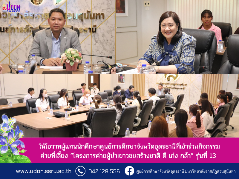 วันที่ 15 มีนาคม 2566 ผู้ช่วยศาสตราจารย์ ดร.ภัทรวิทย์ อยู่วัฒนะ ผู้อำนวยการศูนย์การศึกษาจังหวัดอุดรธานี มหาวิทยาลัยราชภัฏสวนสุนันทา พร้อมด้วยอาจารย์ ดร.วลีรัตน์ แสงไชย รองผู้อำนวยการฝ่ายวิชาการ พบผู้แทนนักศึกษาศูนย์การศึกษาจังหวัดอุดรธานีที่เข้าร่วมกิจกรรมค่ายพี่เลี้ยง “โครงการค่ายผู้นำเยาวชนสร้างชาติ ดี เก่ง กล้า” รุ่นที่ 13