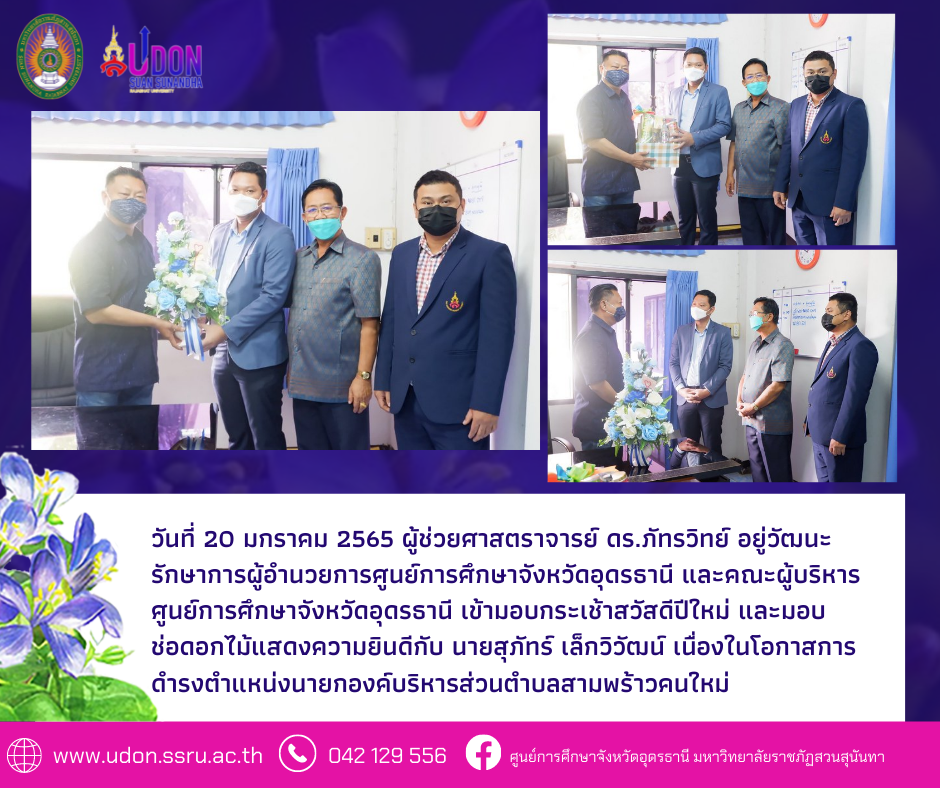 วันที่ 20 มกราคม 2565 ผู้ช่วยศาสตราจารย์ ดร.ภัทรวิทย์ อยู่วัฒนะ รักษาการผู้อำนวยการศูนย์การศึกษาจังหวัดอุดรธานี และคณะผู้บริหารศูนย์การศึกษาจังหวัดอุดรธานี เข้ามอบกระเช้าสวัสดีปีใหม่ และมอบช่อดอกไม้แสดงความยินดีกับ นายสุภัทร์ เล็กวิวัฒน์ เนื่องในโอกาสการดำรงตำแหน่งนายกองค์บริหารส่วนตำบลสามพร้าวคนใหม่