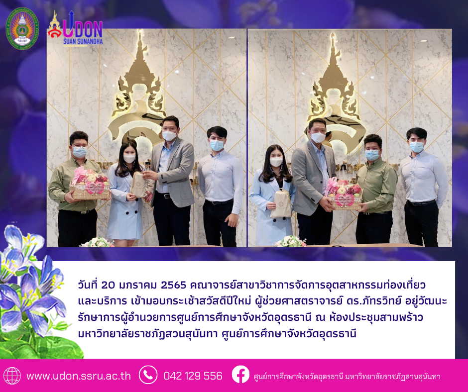 วันที่ 20 มกราคม 2565 คณาจารย์สาขาวิชาการจัดการอุตสาหกรรมท่องเที่ยวและบริการ เข้ามอบกระเช้าสวัสดีปีใหม่ ผู้ช่วยศาสตราจารย์ ดร.ภัทรวิทย์ อยู่วัฒนะ รักษาการผู้อำนวยการศูนย์การศึกษาจังหวัดอุดรธานี ณ ห้องประชุมสามพร้าว มหาวิทยาลัยราชภัฏสวนสุนันทา ศูนย์การศึกษาจังหวัดอุดรธานี