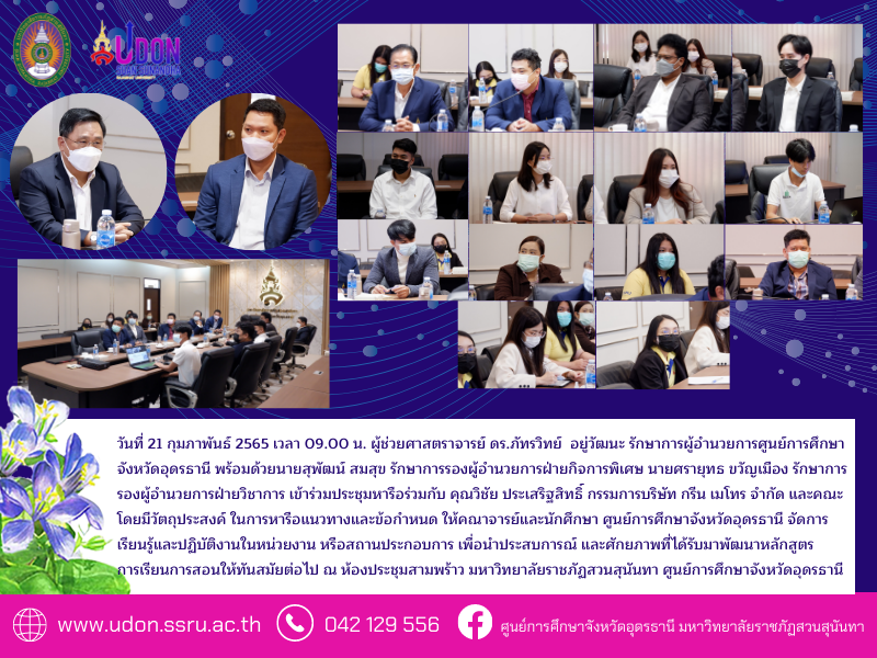 วันที่ 21 กุมภาพันธ์ 2565 เวลา 09.00 น. ผู้ช่วยศาสตราจารย์ ดร.ภัทรวิทย์ อยู่วัฒนะ รักษาการผู้อำนวยการศูนย์การศึกษาจังหวัดอุดรธานี พร้อมด้วยนายสุพัฒน์ สมสุข รักษาการรองผู้อำนวยการฝ่ายกิจการพิเศษ นายศรายุทธ ขวัญเมือง รักษาการรองผู้อำนวยการฝ่ายวิชาการ เข้าร่วมประชุมหารือร่วมกับ คุณวิชัย ประเสริฐสิทธิ์ กรรมการบริษัท กรีน เมโทร จำกัด และคณะ โดยมีวัตถุประสงค์ ในการหารือแนวทางและข้อกำหนด ให้คณาจารย์และนักศึกษา ศูนย์การศึกษาจังหวัดอุดรธานี จัดการเรียนรู้และปฏิบัติงานในหน่วยงาน หรือสถานประกอบการ เพื่อนำประสบการณ์ และศักยภาพที่ได้รับมาพัฒนาหลักสูตรการเรียนการสอนให้ทันสมัยต่อไป ณ ห้องประชุมสามพร้าว มหาวิทยาลัยราชภัฏสวนสุนันทา ศูนย์การศึกษาจังหวัดอุดรธานี