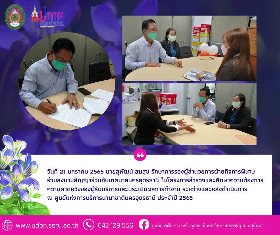 วันที่ 21 มกราคม 2565 นายสุพัฒน์ สมสุข รักษาการรองผู้อำนวยการฝ่ายกิจการพิเศษ ร่วมลงนามสัญญาร่วมกับเทศบาลนครอุดรธานี ในโครงการสำรวจและศึกษาความต้องการความคาดหวังของผู้รับบริการและประเมินผลการทำงาน ระหว่างและหลังดำเนินการ ณ ศูนย์แห่งการบริการนานาชาตินครอุดรธานี ประจำปี 2565