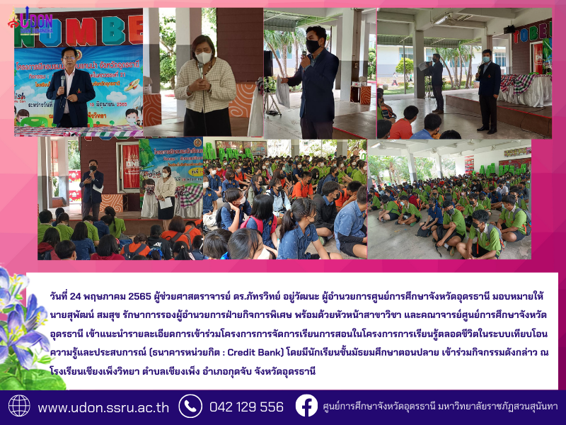 วันที่ 24 พฤษภาคม 2565 ผู้ช่วยศาสตราจารย์ ดร.ภัทรวิทย์ อยู่วัฒนะ ผู้อำนวยการศูนย์การศึกษาจังหวัดอุดรธานี มอบหมายให้นายสุพัฒน์ สมสุข รักษาการรองผู้อำนวยการฝ่ายกิจการพิเศษ พร้อมด้วยหัวหน้าสาขาวิชา และคณาจารย์ศูนย์การศึกษาจังหวัดอุดรธานี เข้าแนะนำรายละเอียดการเข้าร่วมโครงการการจัดการเรียนการสอนในโครงการการเรียนรู้ตลอดชีวิตในระบบเทียบโอนความรู้และประสบการณ์ (ธนาคารหน่วยกิต : Credit Bank) โดยมีนักเรียนชั้นมัธยมศึกษาตอนปลาย เข้าร่วมกิจกรรมดังกล่าว ณ โรงเรียนเชียงเพ็งวิทยา ตำบลเชียงเพ็ง อำเภอกุดจับ จังหวัดอุดรธานี