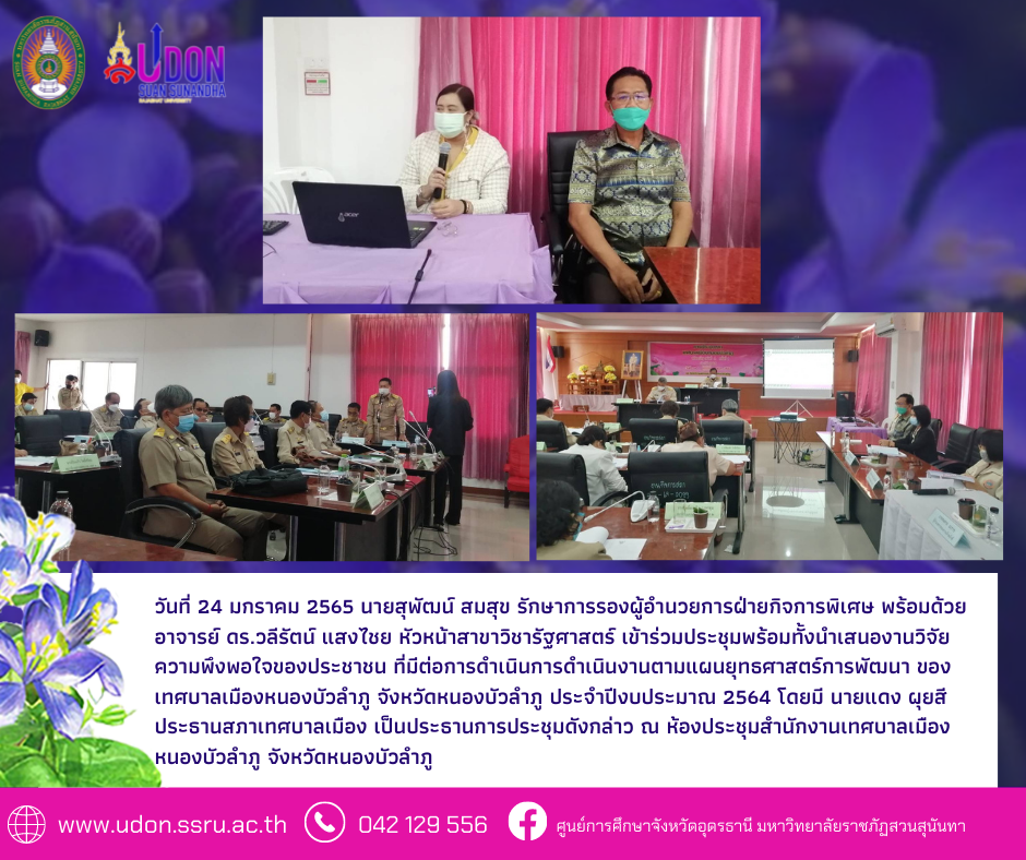วันที่ 24 มกราคม 2565 นายสุพัฒน์ สมสุข รักษาการรองผู้อำนวยการฝ่ายกิจการพิเศษ พร้อมด้วย อาจารย์ ดร.วลีรัตน์ แสงไชย หัวหน้าสาขาวิชารัฐศาสตร์ เข้าร่วมประชุมพร้อมทั้งนำเสนองานวิจัยความพึงพอใจของประชาชน ที่มีต่อการดำเนินการดำเนินงานตามแผนยุทธศาสตร์การพัฒนา ของเทศบาลเมืองหนองบัวลำภู จังหวัดหนองบัวลำภู ประจำปีงบประมาณ 2564 โดยมี นายแดง ผุยสี ประธานสภาเทศบาลเมือง เป็นประธานการประชุมดังกล่าว ณ ห้องประชุมสำนักงานเทศบาลเมืองหนองบัวลำภู จังหวัดหนองบัวลำภู
