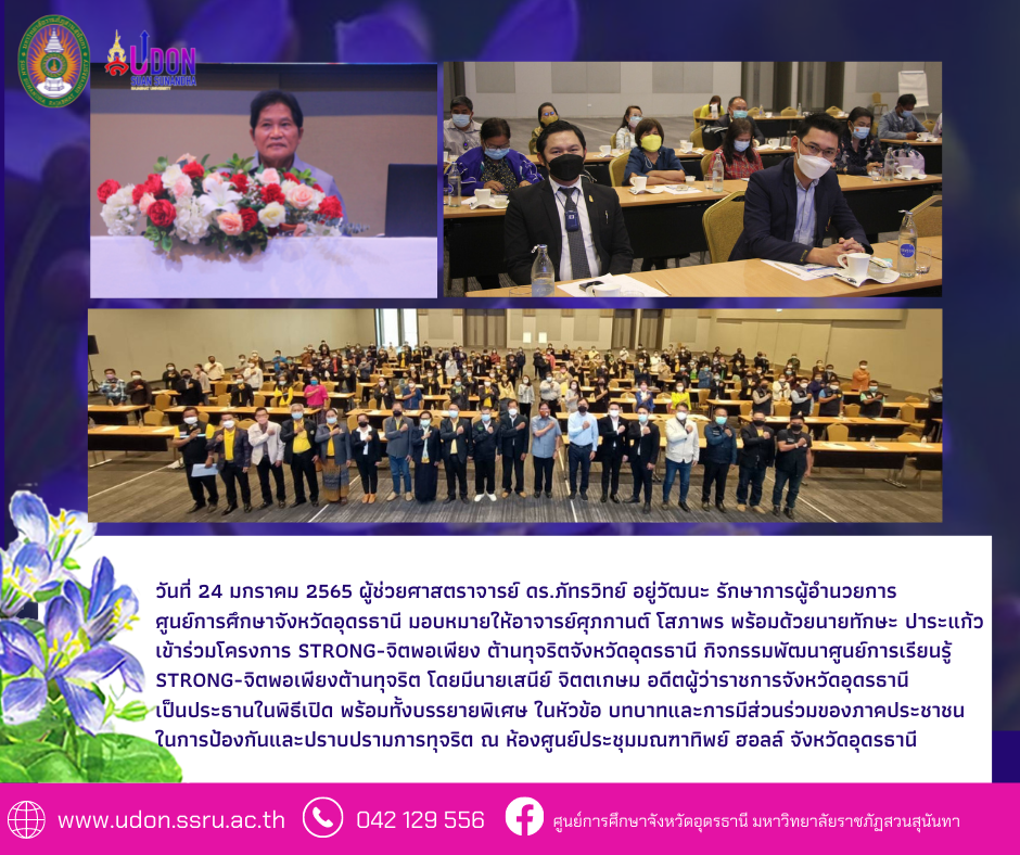 วันที่ 24 มกราคม 2565 ผู้ช่วยศาสตราจารย์ ดร.ภัทรวิทย์ อยู่วัฒนะ รักษาการผู้อำนวยการศูนย์การศึกษาจังหวัดอุดรธานี มอบหมายให้อาจารย์ศุภกานต์ โสภาพร พร้อมด้วยนายทักษะ ปาระแก้ว เข้าร่วมโครงการ STRONG-จิตพอเพียง ต้านทุจริตจังหวัดอุดรธานี กิจกรรมพัฒนาศูนย์การเรียนรู้ STRONG-จิตพอเพียงต้านทุจริต โดยมีนายเสนีย์ จิตตเกษม อดีตผู้ว่าราชการจังหวัดอุดรธานี เป็นประธานในพิธีเปิด พร้อมทั้งบรรยายพิเศษ ในหัวข้อ บทบาทและการมีส่วนร่วมของภาคประชาชนในการป้องกันและปราบปรามการทุจริต ณ ห้องศูนย์ประชุมมณฑาทิพย์ ฮอลล์ จังหวัดอุดรธานี