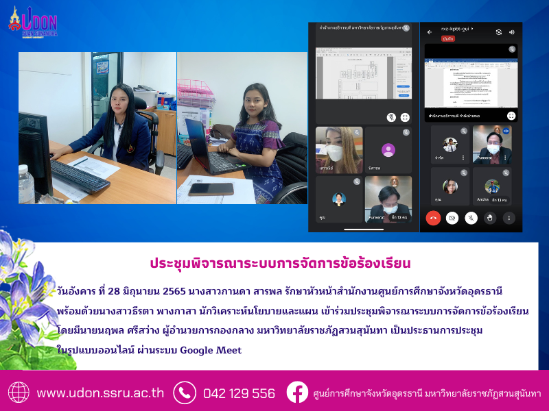 วันอังคาร ที่ 28 มิถุนายน 2565 นางสาวกานดา สารพล รักษาหัวหน้าสำนักงานศูนย์การศึกษาจังหวัดอุดรธานี พร้อมด้วยนางสาวธีรตา พางกาสา นักวิเคราะห์นโยบายและแผน เข้าร่วมประชุมพิจารณาระบบการจัดการข้อร้องเรียน โดยมีนายนฤพล ศรีสว่าง ผู้อำนวยการกองกลาง มหาวิทยาลัยราชภัฏสวนสุนันทา เป็นประธานการประชุม ในรูปแบบออนไลน์ ผ่านระบบ Google Meet
