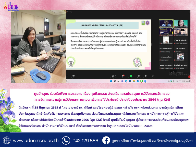 ศูนย์ฯอุดร ร่วมรับฟังการบรรยาย เรื่องทุนกิจกรรม ส่งเสริมและสนับสนุนการวิจัยและนวัตกรรม การจัดการความรู้การวิจัยและถ่ายทอด เพื่อการใช้ประโยชน์ ประจำปีงบประมาณ 2566 (ทุน KM)