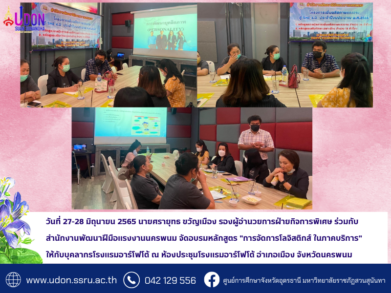 วันที่ 27-28 มิถุนายน 2565 นายศรายุทธ ขวัญเมือง รองผู้อำนวยการฝ่ายกิจการพิเศษ ร่วมกับ สำนักงานพัฒนาฝีมือแรงงานนครพนม จัดอบรมหลักสูตร "การจัดการโลจิสติกส์ ในภาคบริการ" ให้กับบุคลากรโรงแรมอาร์โฟโต้ ณ ห้องประชุมโรงแรมอาร์โฟโต้ อำเภอเมือง จังหวัดนครพนม