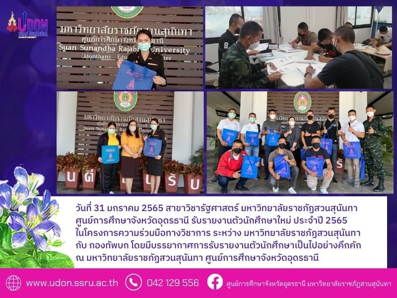 วันที่ 31 มกราคม 2565 สาขาวิชารัฐศาสตร์ มหาวิทยาลัยราชภัฏสวนสุนันทา ศูนย์การศึกษาจังหวัดอุดรธานี รับรายงานตัวนักศึกษาใหม่ ประจำปี 2565 ในโครงการความร่วมมือทางวิชาการ ระหว่าง มหาวิทยาลัยราชภัฏสวนสุนันทา กับ กองทัพบก โดยมีบรรยากาศการรับรายงานตัวนักศึกษา เป็นไปอย่างคึกคัก ณ มหาวิทยาลัยราชภัฏสวนสุนันทา ศูนย์การศึกษาจังหวัดอุดรธานี