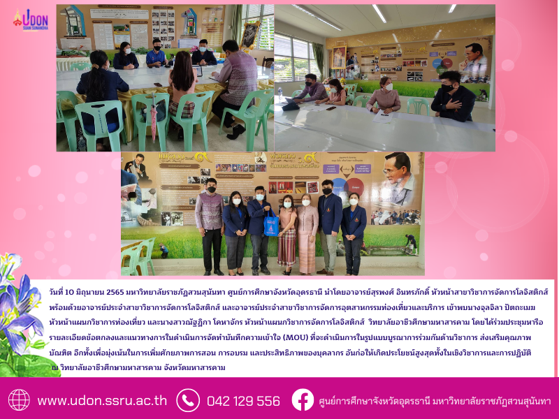 วันที่ 10 มิถุนายน 2565 มหาวิทยาลัยราชภัฏสวนสุนันทา ศูนย์การศึกษาจังหวัดอุดรธานี นำโดยอาจารย์สุรพงศ์ อินทรภักดิ์ หัวหน้าสาขาวิชาการจัดการโลจิสติกส์ พร้อมด้วยอาจารย์ประจำสาขาวิชาการจัดการโลจิสติกส์ และอาจารย์ประจำสาขาวิชาการจัดการอุตสาหกรรมท่องเที่ยวและบริการ เข้าพบนางจุลจิลา ปัตถะเมฆ หัวหน้าแผนกวิชาการท่องเที่ยว และนางสาวณัฐฏิกา โคหาจักร หัวหน้าแผนกวิชาการจัดการโลจิสติกส์ วิทยาลัยอาชีวศึกษามหาสารคาม โดยได้ร่วมประชุมหารือรายละเอียดข้อตกลงและแนวทางการในดำเนินการจัดทำบันทึกความเข้าใจ (MOU) ที่จะดำเนินการในรูปแบบบูรณาการร่วมกันด้านวิชาการ ส่งเสริมคุณภาพบัณฑิต อีกทั้งเพื่อมุ่งเน้นในการเพิ่มศักยภาพการสอน การอบรม และประสิทธิภาพของบุคลากร อันก่อให้เกิดประโยชน์สูงสุดทั้งในเชิงวิชาการและการปฏิบัติ ณ วิทยาลัยอาชีวศึกษามหาสารคาม จังหวัดมหาสารคาม