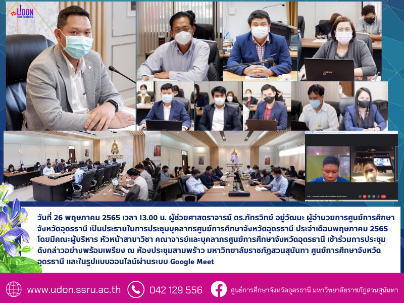 วันที่ 26 พฤษภาคม 2565 เวลา 13.00 น. ผู้ช่วยศาสตราจารย์ ดร.ภัทรวิทย์ อยู่วัฒนะ ผู้อำนวยการศูนย์การศึกษาจังหวัดอุดรธานี เป็นประธานในการประชุมบุคลากรศูนย์การศึกษาจังหวัดอุดรธานี ประจำเดือนพฤษภาคม 2565 โดยมีคณะผู้บริหาร หัวหน้าสาขาวิชา คณาจารย์และบุคลากรศูนย์การศึกษาจังหวัดอุดรธานี เข้าร่วมการประชุมดังกล่าวอย่างพร้อมเพรียง ณ ห้องประชุมสามพร้าว มหาวิทยาลัยราชภัฏสวนสุนันทา ศูนย์การศึกษาจังหวัดอุดรธานี และในรูปแบบออนไลน์ผ่านระบบ Google Meet