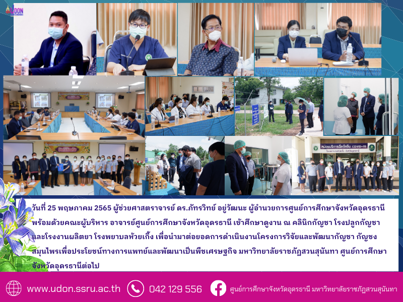 วันที่ 25 พฤษภาคม 2565 ผู้ช่วยศาสตราจารย์ ดร.ภัทรวิทย์ อยู่วัฒนะ ผู้อำนวยการศูนย์การศึกษาจังหวัดอุดรธานี พร้อมด้วยคณะผู้บริหาร อาจารย์ศูนย์การศึกษาจังหวัดอุดรธานี เข้าศึกษาดูงาน ณ คลินิกกัญชา โรงปลูกกัญชา และโรงงานผลิตยา โรงพยาบลห้วยเกิ้ง เพื่อนำมาต่อยอดการดำเนินงานโครงการวิจัยและพัฒนากัญชา กัญชง สมุนไพรเพื่อประโยชน์ทางการแพทย์และพัฒนาเป็นพืชเศรษฐกิจ มหาวิทยาลัยราชภัฏสวนสุนันทา ศูนย์การศึกษาจังหวัดอุดรธานีต่อไป
