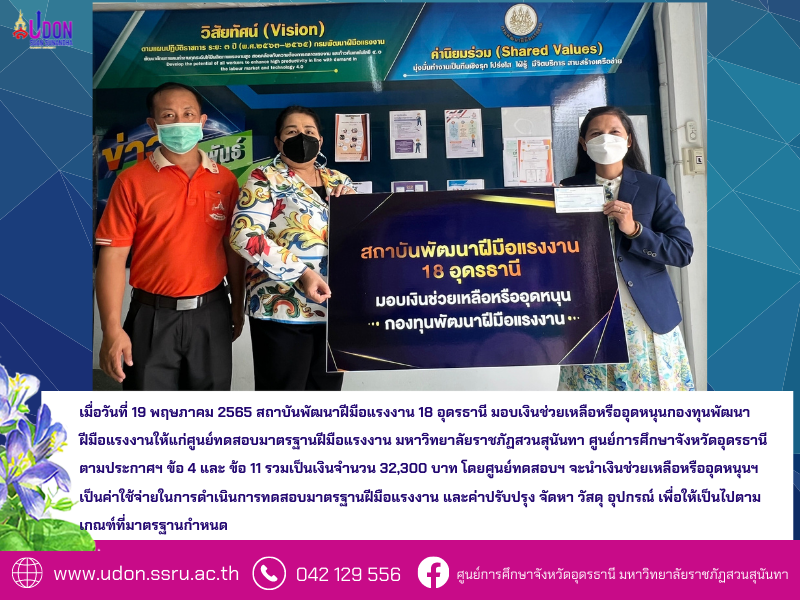 เมื่อวันที่ 19 พฤษภาคม 2565 สถาบันพัฒนาฝีมือแรงงาน 18 อุดรธานี มอบเงินช่วยเหลือหรืออุดหนุนกองทุนพัฒนาฝีมือแรงงานให้แก่ศูนย์ทดสอบมาตรฐานฝีมือแรงงาน มหาวิทยาลัยราชภัฏสวนสุนันทา ศูนย์การศึกษาจังหวัดอุดรธานี ตามประกาศฯ ข้อ 4 และ ข้อ 11 รวมเป็นเงินจำนวน 32,300 บาท