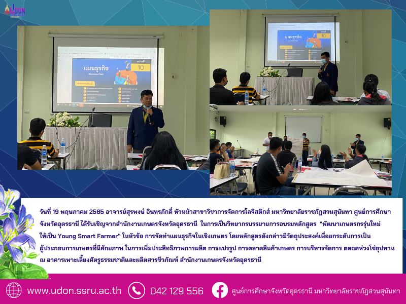 วันที่ 19 พฤษภาคม 2565 อาจารย์สุรพงศ์ อินทรภักดิ์ หัวหน้าสาขาวิชาการจัดการโลจิสติกส์ มหาวิทยาลัยราชภัฏสวนสุนันทา ศูนย์การศึกษาจังหวัดอุดรธานี ได้รับเชิญจากสำนักงานเกษตรจังหวัดอุดรธานี ในการเป็นวิทยากรบรรยายการอบรมหลักสูตร "พัฒนาเกษตรกรรุ่นใหม่ ให้เป็น Young Smart Farmer" ในหัวข้อ การจัดทำแผนธุรกิจในเชิงเกษตร โดยหลักสูตรดังกล่าวมีวัตถุประสงค์เพื่อยกระดับการเป็นผู้ประกอบการเกษตรที่มีศักยภาพ ในการเพิ่มประสิทธิภาพการผลิต การแปรรูป การตลาดสินค้าเกษตร การบริหารจัดการ ตลอดห่วงโซ่อุปทาน ณ อาคารเพาะเลี้ยงศัตรูธรรมชาติและผลิตสารชีวภัณฑ์ สำนักงานเกษตรจังหวัดอุดรธานี