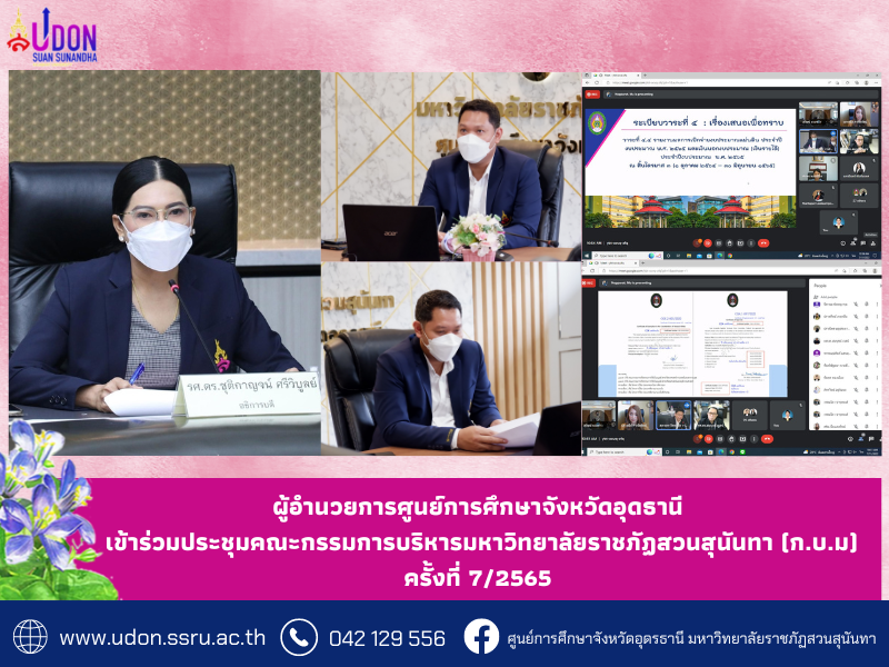 วันที่ 11 กรกฎาคม พ.ศ. 2565 เวลา 09.30 น. ผู้ช่วยศาสตราจารย์ ดร.ภัทรวิทย์ อยู่วัฒนะ ผู้อำนวยการศูนย์การศึกษาจังหวัดอุดรธานี เข้าร่วมประชุม "คณะกรรมการบริหารมหาวิทยาลัยราชภัฏสวนสุนันทา (ก.บ.ม.) ครั้งที่ 7/2565" โดยมี รศ.ดร.ชุติกาญจน์ ศรีวิบูลย์ อธิการบดี เป็นประธานในที่ประชุม ในรูปแบบออนไลน์ ผ่านระบบ Google Meet