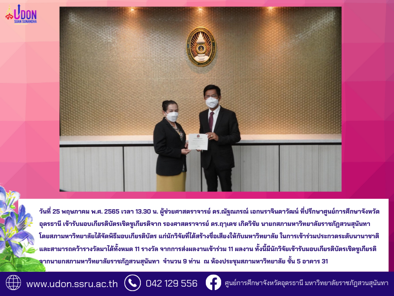 วันที่ 25 พฤษภาคม พ.ศ. 2565 เวลา 13.30 น. ผู้ช่วยศาสตราจารย์ ดร.ณัฐณภรณ์ เอกนราจินดาวัฒน์ ที่ปรึกษาศูนย์การศึกษาจังหวัดอุดรธานี เข้ารับมอบเกียรติบัตรเชิดชูเกียรติจาก รองศาสตราจารย์ ดร.ฤๅเดช เกิดวิชัย นายกสภามหาวิทยาลัยราชภัฏสวนสุนันทา โดยสภามหาวิทยาลัยได้จัดพิธีมอบเกียรติบัตร แก่นักวิจัยที่ได้สร้างชื่อเสียงให้กับมหาวิทยาลัย ในการเข้าร่วมประกวดระดับนานาชาติ และสามารถคว้ารางวัลมาได้ทั้งหมด 11 รางวัล จากการส่งผลงานเข้าร่วม 11 ผลงาน ทั้งนี้มีนักวิจัยเข้ารับมอบเกียรติบัตรเชิดชูเกียรติจากนายกสภามหาวิทยาลัยราชภัฏสวนสุนันทา จำนวน 9 ท่าน ณ ห้องประชุมสภามหาวิทยาลัย ชั้น 5 อาคาร 31