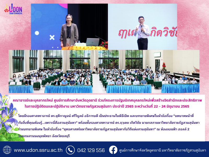 คณาจารย์และบุคลากรใหม่ ศูนย์การศึกษาจังหวัดอุดธานี ร่วมโครงการปฐมนิเทศบุคลกรใหม่เพื่อสร้างจิตสำนึกและประสิทธิภาพในการปฏิบัติตนและปฏิบัติงาน มหาวิทยราชภัฏสวนสุนันทา ประจำปี 2565 ระหว่างวันที่ 22 – 24 มิถุนายน 2565