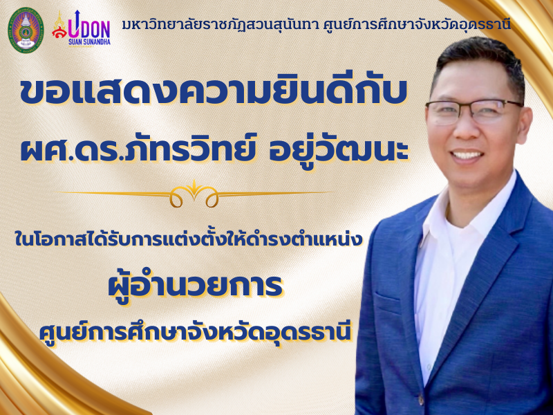 มหาวิทยาลัยราชภัฏสวนสุนันทา ศูนย์การศึกษาจังหวัดอุดรธานี ขอแสดงความยินดีกับ ผู้ช่วยศาสตราจารย์ ดร.ภัทรวิทย์ อยู่วัฒนะ ที่ได้รับการแต่งตั้งให้ดำรงตำแหน่ง "ผู้อำนวยการศูนย์การศึกษาจังหวัดอุดรธานี"