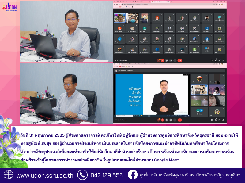 วันที่ 31 พฤษภาคม 2565 ผู้ช่วยศาสตราจารย์ ดร.ภัทรวิทย์ อยู่วัฒนะ ผู้อำนวยการศูนย์การศึกษาจังหวัดอุดรธานี มอบหมายให้นายสุพัฒน์ สมสุข รองผู้อำนวยการฝ่ายบริหาร เป็นประธานในการเปิดโครงการแนะนำอาชีพให้กับนักศึกษา โดยโครงการดังกล่าวมีวัตถุประสงค์เพื่อแนะนำอาชีพให้แก่นักศึกษาที่กำลังจะสำเร็จการศึกษา พร้อมทั้งเทคนิคและการเตรียมความพร้อมก่อนก้าวเข้าสู่โลกของการทำงานอย่างมืออาชีพ ในรูปแบบออนไลน์ผ่านระบบ Google Meet