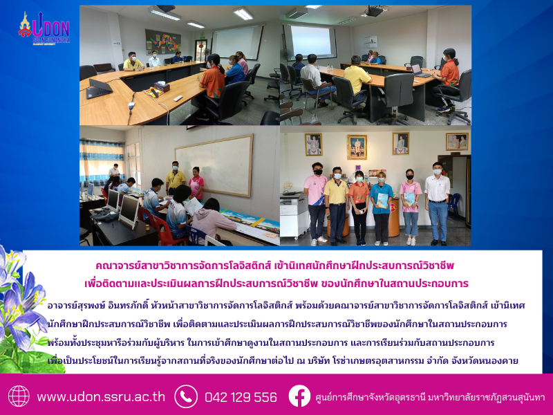 อาจารย์สุรพงษ์ อินทรภักดิ์ หัวหน้าสาขาวิชาการจัดการโลจิสติกส์ พร้อมด้วยคณาจารย์สาขาวิชาการจัดการโลจิสติกส์ เข้านิเทศนักศึกษาฝึกประสบการณ์วิชาชีพ เพื่อติดตามและประเมินผลการฝึกประสบการณ์วิชาชีพของนักศึกษาในสถานประกอบการ พร้อมทั้งประชุมหารือร่วมกับผู้บริหาร ในการเข้าศึกษาดูงานในสถานประกอบการ และการเรียนร่วมกับสถานประกอบการ เพื่อเป็นประโยชน์ในการเรียนรู้จากสถานที่จริงของนักศึกษาต่อไป