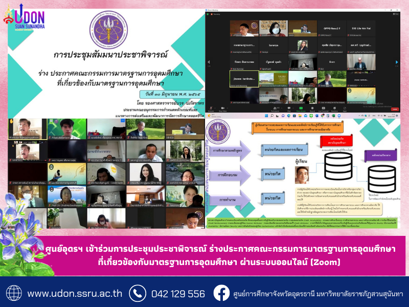 วันพฤหัสบดี ที่ 30 มิถุนายน 2565 ผู้ช่วยศาสตราจารย์ ดร.ภัทรวิทย์ อยู่วัฒนะ ผู้อำนวยการศูนย์การศึกษาจังหวัดอุดรธานี มอบหมายให้ อาจารย์ ดร.วลีรัตน์ แสงไชย รองผู้อำนวยการฝ่ายวิชาการ พร้อมด้วยหัวหน้าสาขาวิชา เข้าร่วมการประชุมประชาพิจารณ์ ร่างประกาศคณะกรรมการมาตรฐานการอุดมศึกษาที่เกี่ยวข้องกับมาตรฐานการอุดมศึกษา ผ่านระบบออนไลน์ (Zoom) โดย รองศาสตราจารย์บวร ปภัสราทร ประธานคณะอนุกรรมการกำหนดหลักเกณฑ์และแนวทางการส่งเสริมและพัฒนาการจัดการศึกษาตลอดชีวิต เป็นผู้นำการประชุมประชาพิจารณ์ ซึ่งที่ประชุมได้แสดงความคิดเห็นกันอย่างกว้างขวาง และเป็นประโยชน์ในทางวิชาการเป็นอย่างยิ่ง