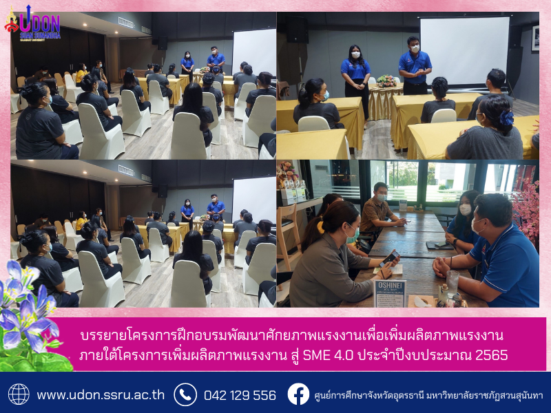 วันที่ 26 กรกฎาคม พ.ศ. 2565 อาจารย์ศรายุทธ ขวัญเมือง รองผู้อำนวยการฝ่ายกิจการพิเศษ พร้อมด้วยอาจารย์นภัสวรรณ คุ้มครอง อาจารย์ประจำสาขาวิชาการจัดการโลจิสติกส์ ได้รับเชิญจากสำนักงานพัฒนาฝีมือแรงงานนครพนม ในการเป็นวิทยากรบรรยายโครงการฝึกอบรมพัฒนาศักยภาพแรงงานเพื่อเพิ่มผลิตภาพแรงงาน ภายใต้โครงการเพิ่มผลิตภาพแรงงาน สู่ SME 4.0 ประจำปีงบประมาณ 2565 โดยโครงการดังกล่าวมีวัตถุประสงค์เพื่อให้ความรู้เกี่ยวกับพื้นฐานการจัดการทางธุรกิจ ส่งเสริมผู้ประกอบการให้มีความรู้เกี่ยวกับเทคนิคการเพิ่มผลิตภาพแรงงาน พัฒนาศักยภาพและพัฒนาทักษะฝีมือแรงงานและเพิ่มขีดความสามารถในการแข่งขันของสถานประกอบกิจการ ณ โรงแรมอาร์โฟโต้ จังหวัดนครพนม