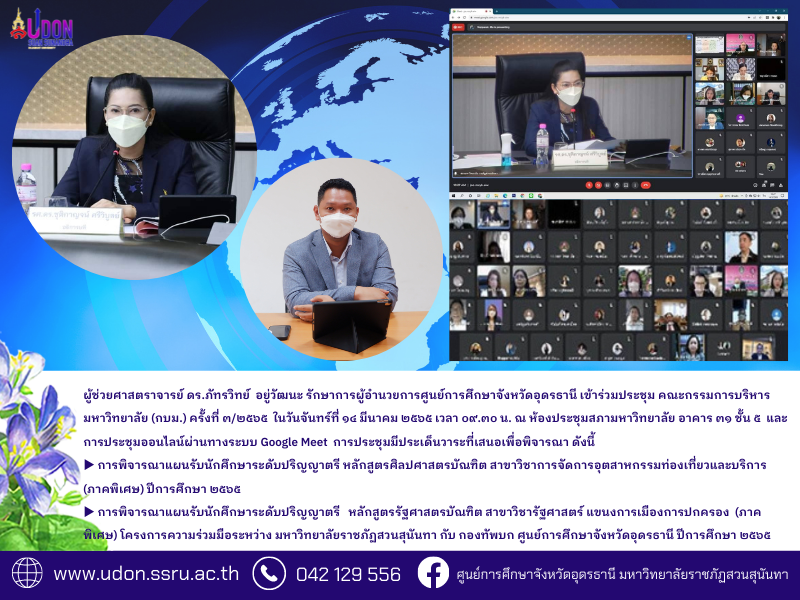 ผู้ช่วยศาสตราจารย์ ดร.ภัทรวิทย์ อยู่วัฒนะ รักษาการผู้อำนวยการศูนย์การศึกษาจังหวัดอุดรธานี เข้าร่วมประชุม คณะกรรมการบริหารมหาวิทยาลัย (กบม.) ครั้งที่ ๓/๒๕๖๕ ในวันจันทร์ที่ ๑๔ มีนาคม ๒๕๖๕ เวลา ๐๙.๓๐ น. ณ ห้องประชุมสภามหาวิทยาลัย อาคาร ๓๑ ชั้น ๕ และการประชุมออนไลน์ผ่านทางระบบ Google Meet การประชุมมีประเด็นวาระที่เสนอเพื่อพิจารณา ดังนี้