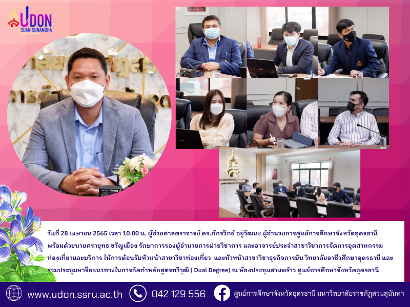 วันที่ 28 เมษายน 2565 เวลา 10.00 น. ผู้ช่วยศาสตราจารย์ ดร.ภัทรวิทย์ อยู่วัฒนะ ผู้อำนวยการศูนย์การศึกษาจังหวัดอุดรธานี พร้อมด้วยนายศรายุทธ ขวัญเมือง รักษาการรองผู้อำนวยการฝ่ายวิชาการ และอาจารย์ประจำสาขาวิชาการจัดการอุตสาหกรรมท่องเที่ยวและบริการ ให้การต้อนรับหัวหน้าสาขาวิชาท่องเที่ยว และหัวหน้าสาขาวิชาธุรกิจการบิน วิทยาลัยอาชีวศึกษาอุดรธานี และร่วมประชุมหารือแนวทางในการจัดทำหลักสูตรทวิวุฒิ ( Dual Degree) ณ ห้องประชุมสามพร้าว ศูนย์การศึกษาจังหวัดอุดรธานี