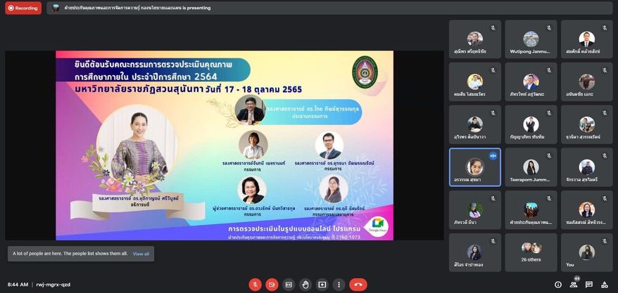 วันที่ 17 ตุลาคม พ.ศ. 2565 เวลา 09.00 น. ผู้ช่วยศาสตราจารย์ ดร.ภัทรวิทย์ อยู่วัฒนะ ผู้อำนวยการศูนย์การศึกษาจังหวัดอุดรธานี มหาวิทยาลัยราชภัฏสวนสุนันทา เข้าร่วมรับการตรวจประเมินคุณภาพการศึกษาภายใน มหาวิทยาลัยราชภัฏสวนสุนันทา ประจำปีการศึกษา 2564 โดยมี รองศาสตราจารย์ ดร.วิทยา เมฆขำ รองอธิการบดีฝ่ายแผนงานและประกันคุณภาพ เป็นประธานเปิดการประชุมพร้อมกล่าวต้อนรับคณะกรรมการการตรวจประเมินฯ ในครั้งนี้ ซึ่งได้รับเกียรติจาก รองศาสตราจารย์ ดร.ไทย ทิพย์สุวรรณกุล เป็นประธานคณะกรรมการตรวจประเมินคุณภาพการศึกษาฯ ผ่านระบบประชุมออนไลน์ โปรแกรม Google Meet