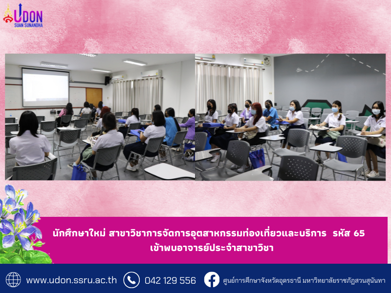 วันที่ 5 กรกฎาคม 2565 นักศึกษาใหม่สาขาวิชาการจัดการอุตสาหกรรมท่องเที่ยวและบริการ ได้เข้าพบอาจารย์ในสาขาวิชา เพื่อรับฟังคำแนะนำด้านวิชาการ ระเบียบข้อบังคับที่เกี่ยวข้องกับนักศึกษา รวมถึงส่วนงานบริการนักศึกษาในด้านต่างๆ ที่นักศึกษาจะต้องติดต่อประสานในระหว่างการศึกษา เพื่อเตรียมความพร้อมก่อนเปิดภาคเรียน ปีการศึกษา 2565