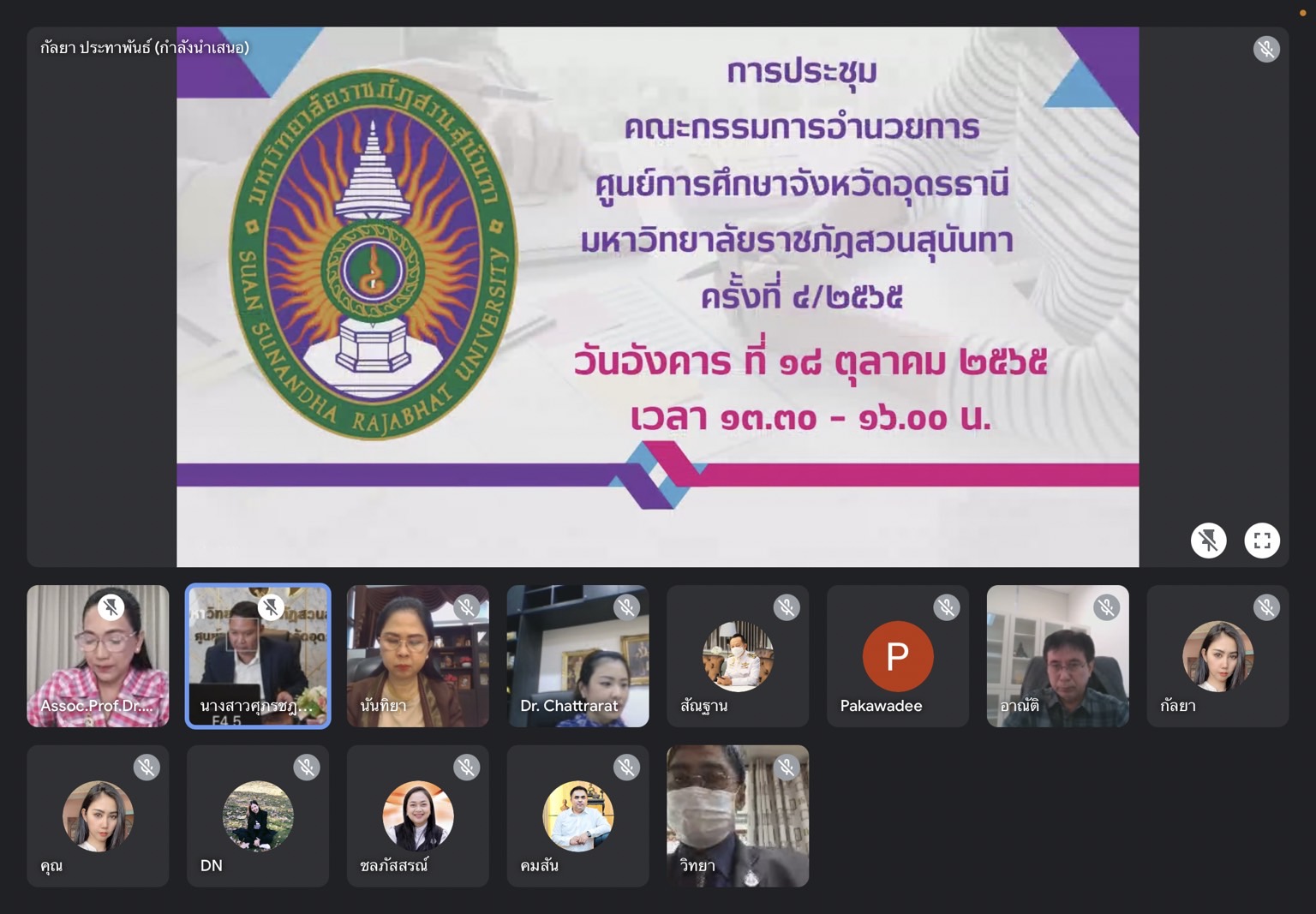 วันที่ 18 ตุลาคม 2565 ผู้ช่วยศาสตราจารย์ ดร.ภัทรวิทย์ อยู่วัฒนะ ผู้อำนวยการศูนย์การศึกษาจังหวัดอุดรธานี ร่วมประชุมคณะกรรมการอำนวยการศูนย์การศึกษาจังหวัดอุดรธานี ครั้งที่ 4/2565 โดยมีรองศาสตราจารย์ ดร.ชุติกาญจน์ ศรีวิบูลย์ อธิการบดีมหาวิทยาลัยราชภัฏสวนสุนันทา เป็นประธานการประชุม พร้อมด้วยคณะผู้บริหารมหาวิทยาลัยราชภัฏสวนสุนันทา ผู้ทรงคุณวุฒิ เข้าร่วมการประชุมดังกล่าว ในรูปแบบออนไลน์ผ่านระบบ Google Meet