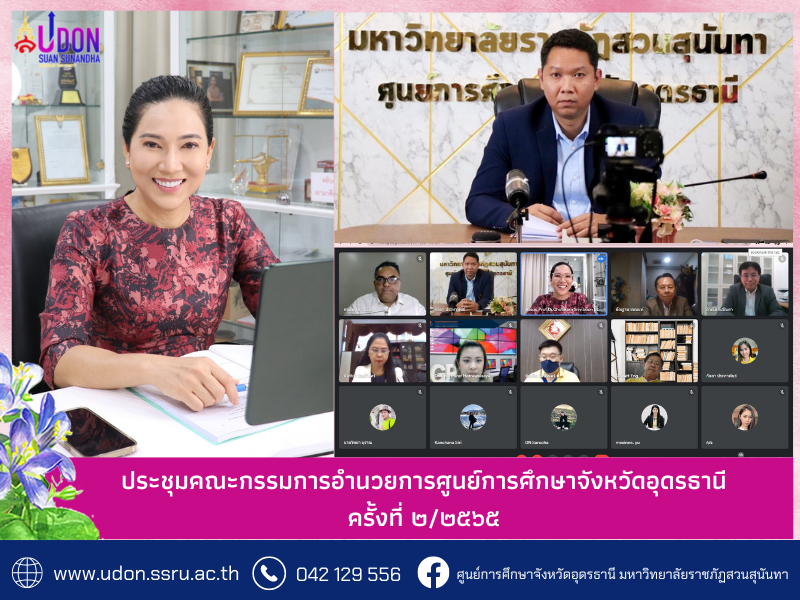 วันจันทร์ ที่ 25 กรกฎาคม 2565 เวลา 13.30 น. ผู้ช่วยศาสตราจารย์ ดร.ภัทรวิทย์ อยู่วัฒนะ ผู้อำนวยการศูนย์การศึกษาจังหวัดอุดรธานี ร่วมประชุมคณะกรรมการอำนวยการศูนย์การศึกษาจังหวัดอุดรธานี ครั้งที่ ๒/๒๕๖๕ โดยมีรองศาสตราจารย์ ดร.ชุติกาญจน์ ศรีวิบูลย์ อธิการบดีมหาวิทยาลัยราชภัฏสวนสุนันทา เป็นประธานการประชุม พร้อมด้วยคณะผู้บริหารมหาวิทยาลัยราชภัฏสวนสุนันทา ผู้ทรงคุณวุฒิ เข้าร่วมการประชุมดังกล่าว ในรูปแบบออนไลน์ผ่านระบบ Google Meet