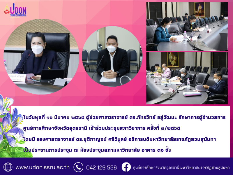 ในวันพุธที่ 16 มีนาคม 2565 ผู้ช่วยศาสตราจารย์ ดร.ภัทรวิทย์ อยู่วัฒนะ รักษาการผู้อำนวยการศูนย์การศึกษาจังหวัดอุดรธานี เข้าร่วมประชุมสภาวิชาการ ครั้งที่ 3/2565 โดยมี รองศาสตราจารย์ ดร.ชุติกาญจน์ ศรีวิบูลย์ อธิการบดีมหาวิทยาลัยราชภัฏสวนสุนันทา เป็นประธานการประชุม ณ ห้องประชุมสภามหาวิทยาลัย อาคาร 31 ชั้น 5