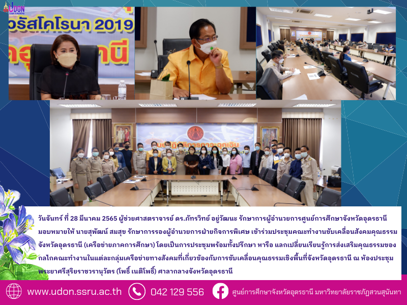 วันจันทร์ ที่ 28 มีนาคม 2565 ผู้ช่วยศาสตราจารย์ ดร.ภัทรวิทย์ อยู่วัฒนะ รักษาการผู้อำนวยการศูนย์การศึกษาจังหวัดอุดรธานี มอบหมายให้ นายสุพัฒน์ สมสุข รักษาการรองผู้อำนวยการฝ่ายกิจการพิเศษ เข้าร่วมประชุมคณะทำงานขับเคลื่อนสังคมคุณธรรมจังหวัดอุดรธานี (เครือข่ายภาคการศึกษา) โดยเป็นการประชุมพร้อมทั้งปรึกษา หารือ แลกเปลี่ยนเรียนรู้การส่งเสริมคุณธรรมของกลไกคณะทำงานในแต่ละกลุ่มเครือข่ายทางสังคมที่เกี่ยวข้องกับการขับเคลื่อนคุณธรรมเชิงพื้นที่จังหวัดอุดรธานี ณ ห้องประชุมพระยาศรีสุริยราชวรานุวัตร (โพธิ์ เนติโพธิ์) ศาลากลางจังหวัดอุดรธานี
